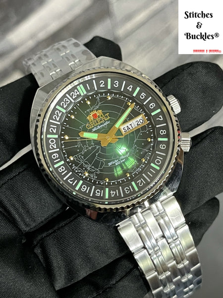 Orient ‘World Map’ Green Dial RA AA0E02E โ Stitches and Buckles